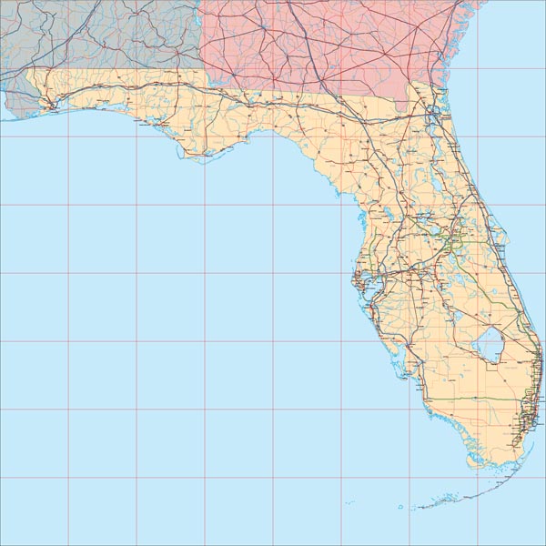 ![]() Detail view of EPS Vector Map of Florida - the land fill color is switched on. The EPS Vector map for Florida has 24 or more layers which may be individually modified or removed. Select the Vector only EPS map of Florida option to download this style map. |